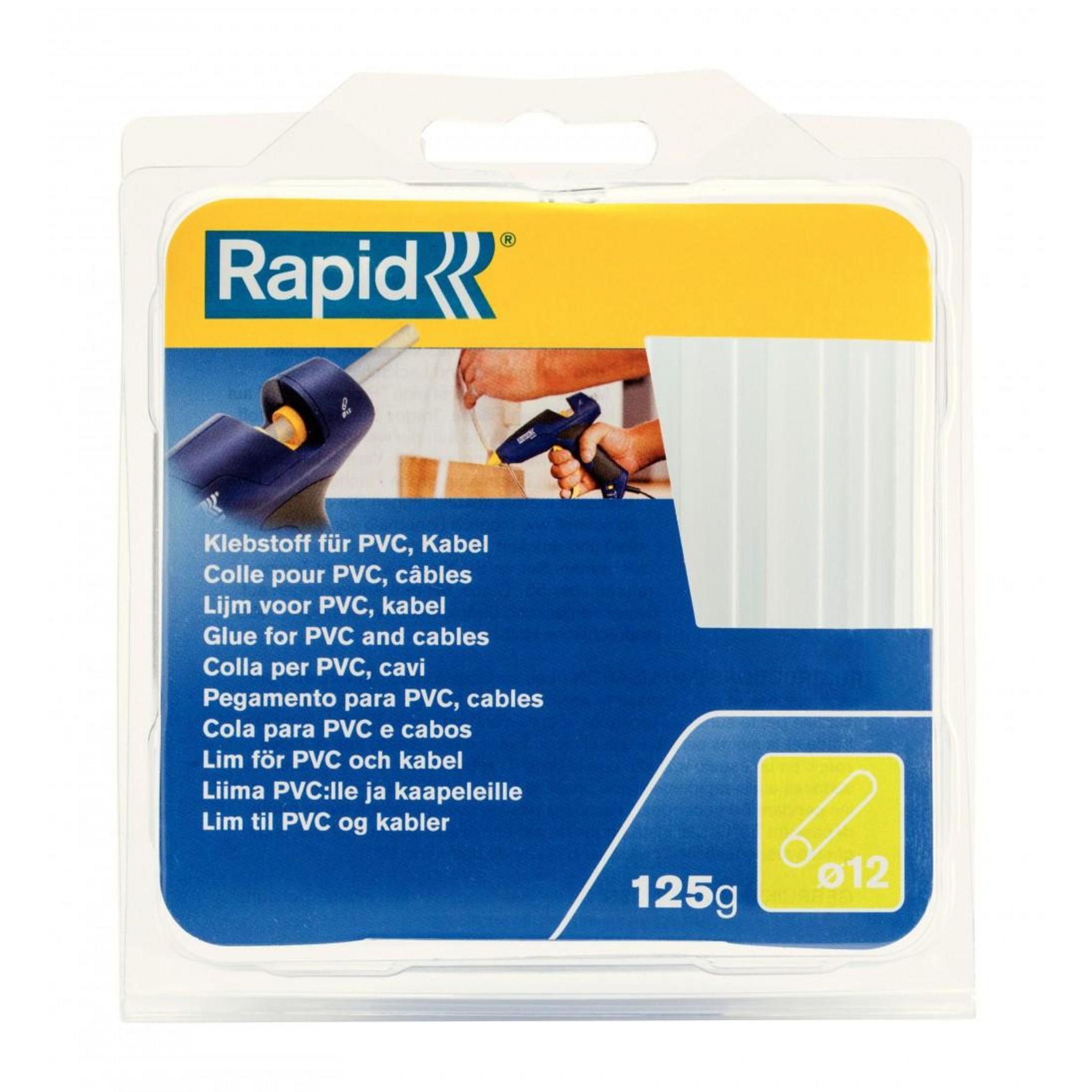 Colle PVC 125 g diam.12Marque du produit: RAPIDUsage du produit: Pour pistolets à colle D12.Nombre de pièces: 1Produit emballé : hauteur (en cm): 13.5Produit emballé : largeur (en cm): 12Produit emballé : profondeur (en cm): 2.4Produit emballé : poids (en kg): 0.15Mentions légales: Dangereux. Respec