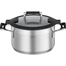 Découvrez la casserole universelle roesle modèle Béton en acier inoxydable 18/10 avec une capacité de 3,5 litres. Conçue pour une répartition uniforme de la chaleur grâce à son fond sandwich encapsulé avec noyau en aluminium de 5 mm, elle est idéale pour saisir viandes, légumes, pâtes et soupes. Elle dispose d'un couvercle innovant avec fonction d'égouttage intégrée, de poignées en silicone résistant jusqu'à 200 °C, et d'un design moderne en inox. Compatible avec tous types de plaques de cuisson et facile à nettoyer au lave-vaisselle, cette casserole mesure 20 cm de diamètre et 17 cm de hauteur. Poids : 2,1 kg.