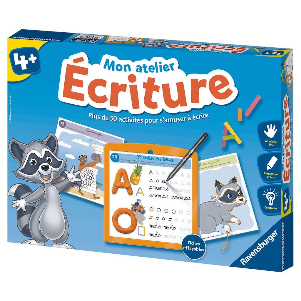 Apprendre en s'amusant les gestes de l'écriture c'est possible avec mon atelier écriture de Ravensburger. Conçues avec des enseignants et inspirées de la pédagogie Montessori, ce coffret te propose plus de 50 activités, ludiques, originales et créatives, pour initier l’enfant aux gestes de l’écriture !