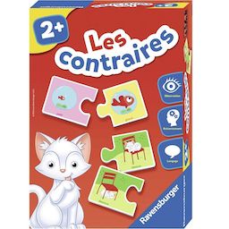 Ce jeu développe la notion d’opposé, les enfants se familiarisent avec les objets et les situations du quotidien tout en enrichissant leur vocabulaire. Ce jeu favorise ainsi le développement du sens de l’observation, du raisonnement et du langage. Ainsi que la motricité avec les cartes puzzles à emboîter.