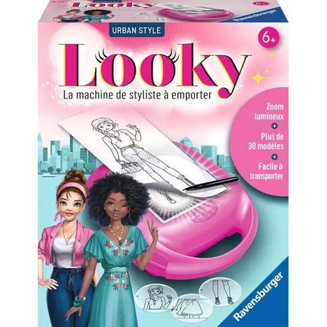 Grâce à la valisette Looky, crée des tenues de mode selon 2 poses mannequin différentes. Son plus ? Le zoom lumineux à 4 niveaux qui permet de grossir les motifs des films modèles et de les combiner entre eux. Plus de 30 combinaisons sont possibles pour créer des looks Urban Style !Pour célébrer la diversité et l'inclusivité, les modèles à dessiner ont des coiffures et des physiques différents pour que toutes les petites filles puissent trouver un modèle auquel elle souhaite s'identifier. Son contenu est renouvelé en proposant non plus des mannequins modèles en taille 34/36 mais 1 modèle taille 38 et 1 modèle taille 42, pour la première fois dans un jeu de dessin de mode ! Dès 6 ans. Fonctionne avec 4 piles LR6 non fournies. Ce produit est composé de matériaux issus de forêts bien gérées certifiées FSC®, de matériaux recyclés et de matériaux issus d'autres sources contrôlées (FSC-C111262).
