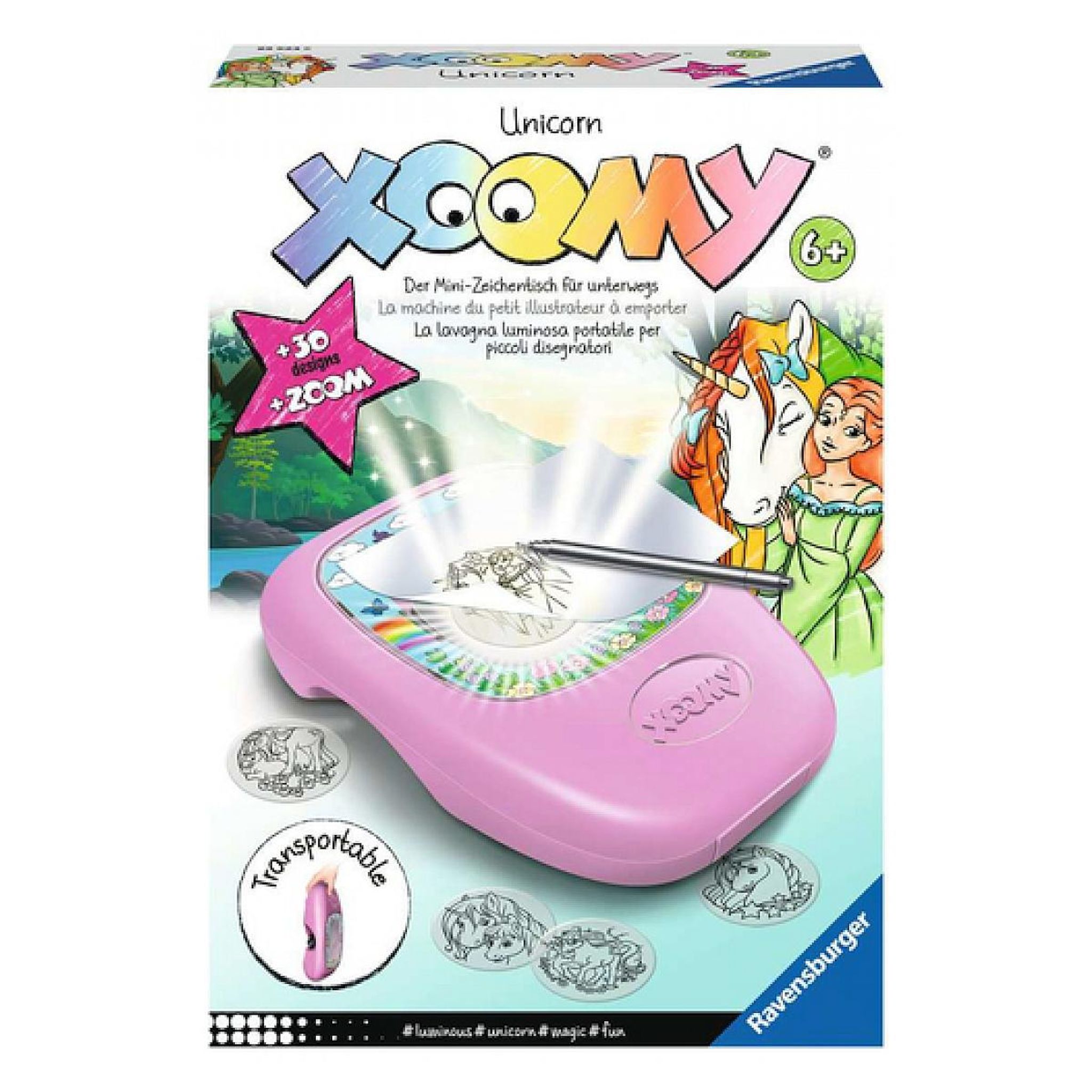 La machine du petit illustrateur à emporter partout !. Une machine à dessin transportable dotée d'un zoom à 4 niveaux. Dessine grâce à la projection du zoom sur la surface de dessin de 10.5 x 21 cm. Amusant pour les enfants, combine les visuels licornes entre eux pour créer un univers magique et féé
