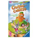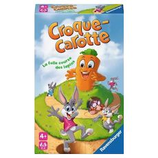 Le Mini jeu Croque Carotte est un passionnant jeu de course rythmé par la roue de la chance, qui indique jusqu'où les lapins peuvent bondir. L'aventure est mouvementée : recouvrez les trous à l'aide des jetons ponts, déplacer l'échelle à votre avantage ou encore faites reculer vos adversaires grâce à la taupe ! Vite, tous vers les cases protégées ! Mais attention, celui qui tombe dans un trou revient au départ !. Le Mini jeu Croque Carotte est basé sur le jeu original Croque Carotte considéré comme un altique des jeux pour enfants avec ses diverses nominations et plus de 10 millions d'exemplaires vendus. Les règles sont simplissimes et s'apprennent en quelques secondes seulement ! Une fois le matériel installé sur la table, toute la famille est prête à jouer. Ce jeu permet d'initier en douceur les enfants aux premiers jeux de société. Après quelques parties et une fois que les enfants sont à l'aise avec le matériel de jeu, ils sont même capables de jouer seuls sans avoir besoin d'un adulte !
