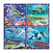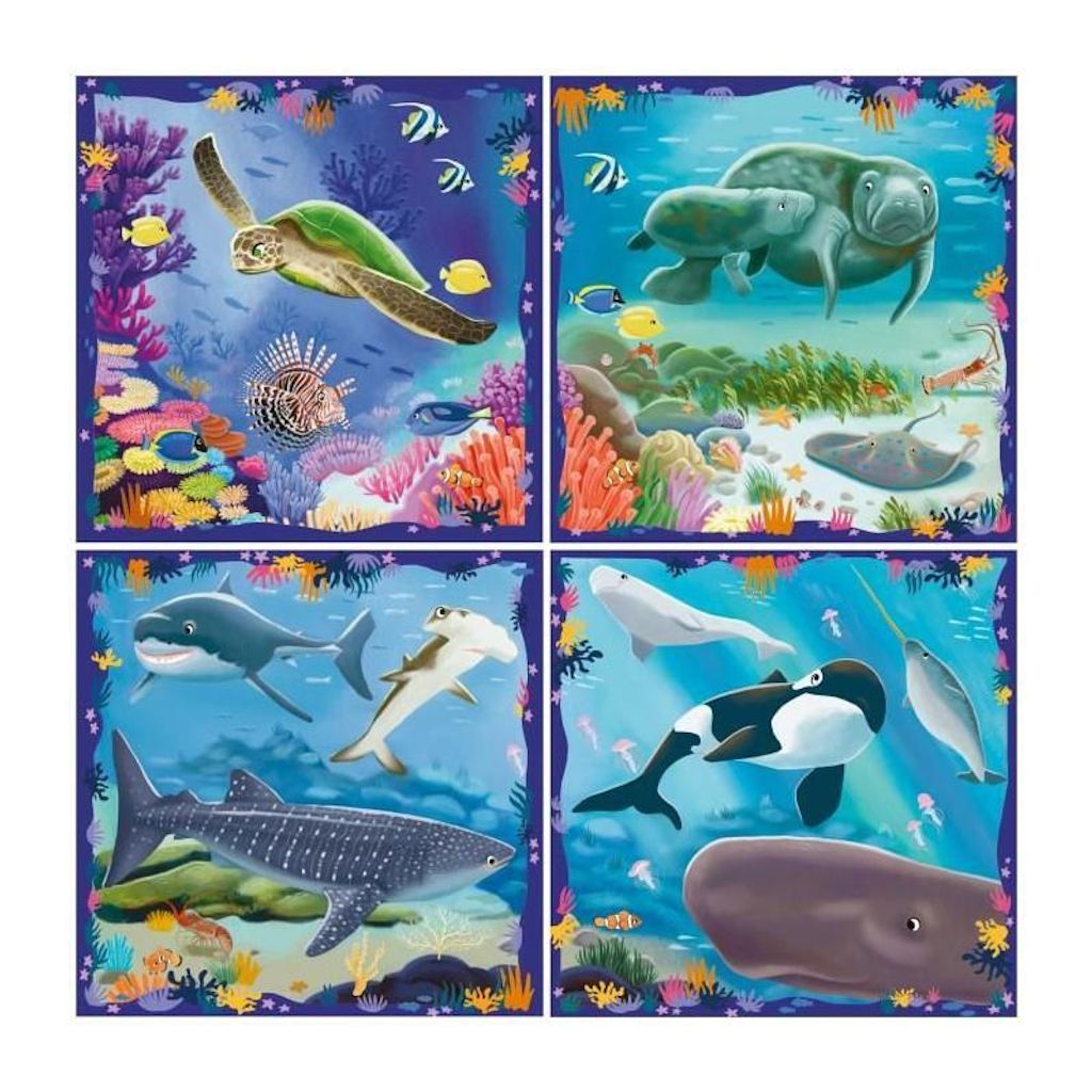 Puzzleup! Animaux marins — puzzle carré 64 pièces conçu pour les enfants dès 5 ans. Illustration colorée et ludique présentant dauphins, poissons exotiques, baleines et autres créatures marines dans un style cartoon agréable et adapté aux plus jeunes. caractéristiques principales : - format : puzzle