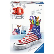 Assemble ce puzzle Ravensburger 3D pour révéler la basket ! Cette sneaker à assembler est constituée de 108 pièces en plastiques, de différentes formes : plates, incurvées ou à charnières, et numérotées. Tu découvriras une superbe sneaker au drapeau américain, en 3 dimensions. La sneaker pourra servir de pot à crayon ou tout simplement d'objet de décoration.