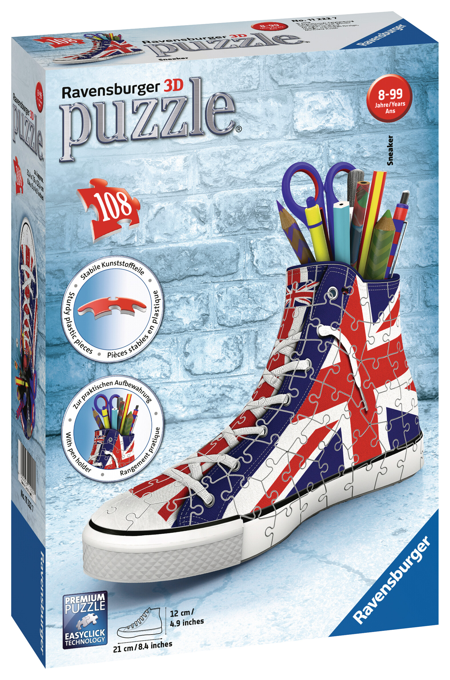 Assemble ce puzzle Ravensburger 3D pour révéler la basket ! Cette sneaker à assembler est constituée de 108 pièces en plastiques, de différentes formes : plates, incurvées ou à charnières, et numérotées. Tu découvriras une superbe sneaker au drapeau anglais, l'Union Jack, en 3 dimensions. La sneaker pourra servir de pot à crayon ou tout simplement d'objet de décoration.