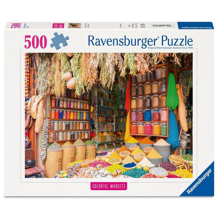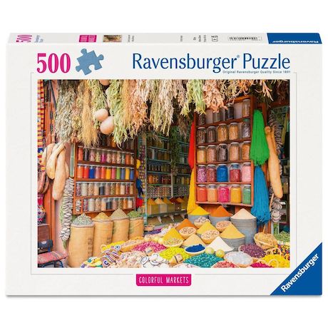 Ce puzzle vous plonge dans l'univers envoûtant d'un souk marocain, où les étals débordent de pyramides d'épices aux couleurs éclatantes, de bouquets d'herbes séchées et de paniers tressés. Entre senteurs de cannelle, de safran et de menthe, ruelles animées et ambiance authentique, chaque pièce recompose une scène riche en détails et en chaleur.