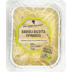 Ingrédients: LAIT écrémé, raviolis cuits (23%) dont: [45% raviolis (semoule de BLÉ dur, ŒUF d’élevage au sol, eau), 38% farce (dont: RICOTTA (contient LAIT), 22% épinards, farine de BLÉ, FROMAGE (contient présure microbienne), eau, sel, levure), eau], FROMAGE (LAIT, sel, présure microbienne, coagulant, colorant : caroténoïdes), huile de colza, tomates, vin blanc, amidon de pommes de terre, amidon modifié de maïs, CRÈME, farine de BLÉ, plantes aromatiques, sel, arôme (contient LAIT), épices.
