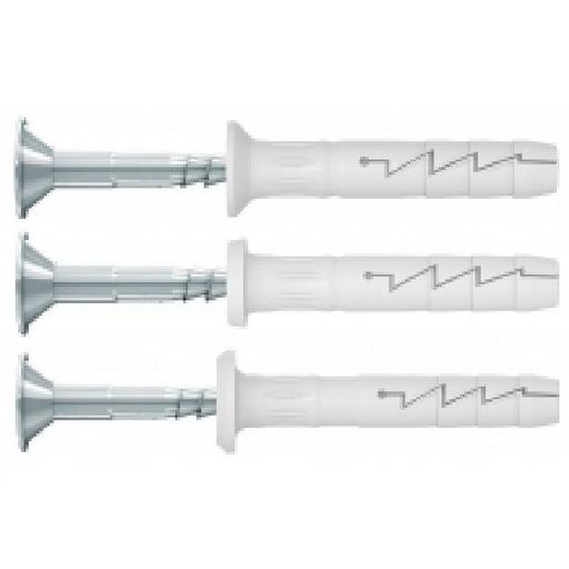 Chevilles FX à collerettes fraisées avec clous-vis acier FX-N-08L045 Ø, 8 x 45 mm pour fixations traversantes spéciales matériaux pleins avec clou fileté prémonté permettant une pose ultra rapide au marteau. Tête du clou-vis renforcée, avec empreinte PZ2. La grande zone de déformation de la cheville garantie l',adaptation aux supports non-homogènes et une tenue supérieure.