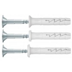 Chevilles FX à collerettes fraisées avec clous-vis acier FX-N-08L080 Ø, 8 x 80 mm pour fixations traversantes spéciales matériaux pleins avec clou fileté prémonté permettant une pose ultra rapide au marteau. Tête du clou-vis renforcée, avec empreinte PZ2. La grande zone de déformation de la cheville garantie l',adaptation aux supports non-homogènes et une tenue supérieure.