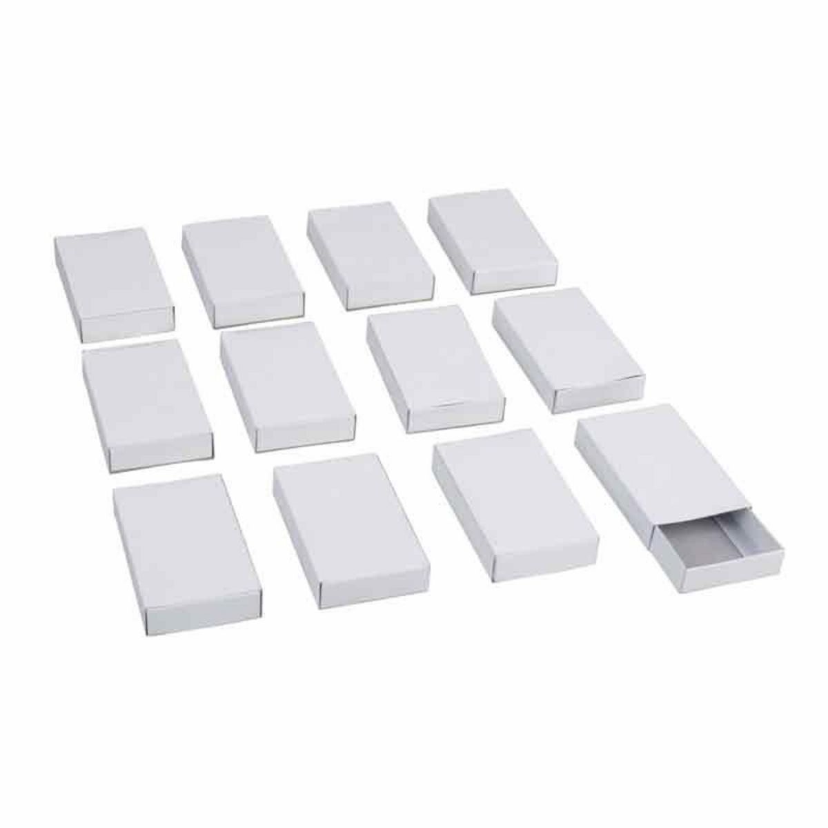 12 boîtes d'allumettes blanches mesurant 11 x 6.5 x 2 cm. Ces boites sont vides et vous permettent de créer des petits décors ou des emballages cadeaux originaux ! Vous pouvez les utiliser en boites cadeaux pour offrir des surprises à Noël ou pour un anniversaire, ou bien les décorer pour en faire de jolis rangements de bureau.