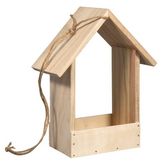 Mangeoire maison en bois. Cette mangeoire bois en forme de maison permet aux petits oiseaux (mésanges, moineaux, sitelles) de se poser sur le rebord du récipient et de manger confortablement les petites graines. La mangeoire est équipée d'une ficelle pour la suspendre à une branche ou à une fenêtre. Mais elle pourra également être posée sur un muret ou un rebord de fenêtre. Ainsi, depuis votre intérieur, en plus de cette bonne action, vous pourrez en profiter pour observer le comportement et la diversité des oiseaux de votre jardin. La mangeoire est en pièces détachées, plaques en bois, clous, cordelette, et à monter. Elle pourra aussi être peinte. Il est recommandé de coller le toit pour une meilleure finition (colle à bois non fournie). Contenu du kit de bricolage : 7 pièces en bois, 17 clous, 1 m de fil de jute. Dimensions de la maisonnette montée : 19,5 x 9,8 x 25 cm.
