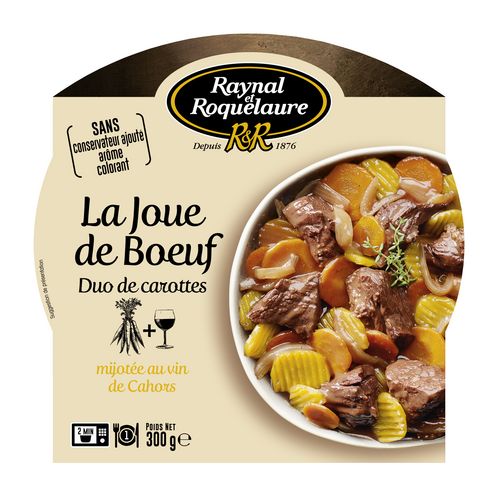 De la joue de boeuf, l'un des morceaux de viande les plus tendres, mijotée dans une sauce au vin de Cahors accompagnée d'un duo de carottes pour une touche de modernité.Ce plat de tradition met bien à l'honneur nos terroirs gastronomiques français !Une recette sans arôme, sans colorant et sans conservateur.La garantie d'un bon repas rapide à préparer pour prendre le temps de le déguster. Joue de bœuf cuisinée au vin de Cahors accompagnée de carottes