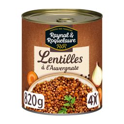 Eau, lentilles précuites 28%, couenne de porc, saindoux, oignons 1%, arôme naturel, farine de BLE, carottes 0,7%, graisse de canard, plante aromatique, arôme naturel de poivre avec autres arômes naturels, affermissant : chlorure de calcium, arôme naturel de CELERI.