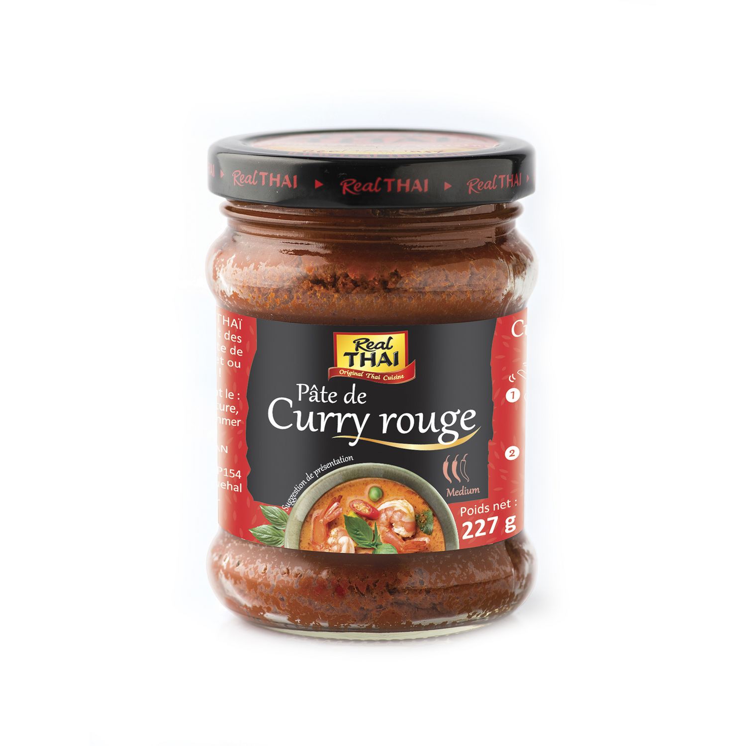 Curry rouge de crevettes – pour 4 personnes Ingrédients : 4 c. à s. de curry rouge Real Thaï – 500ml de lait de coco Real Thaï – 400g de crevettes – – 2 c.à.s. de sauce de poisson -2 c.à.s. de sucre - 1 bouquet de basilic Thai 1. Faire revenir la pâte de curry rouge dans la poêle 2. Ajouter le lait de coco dans la poêle et remuer jusqu'à ébullition 3. Ajouter les crevettes 5. Ajouter le sucre et la sauce de poisson et laisser mijoter. 6. Servez avec le basilic