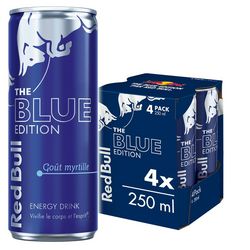 Red Bull, The Blue edition, 4x250ml - La formule unique de Red Bull The Blue edition contient des ingrédients de haute qualité : caféine (0,03%), taurine (0,4%), vitamines du groupe B, sucres, eau. - Une canette de 250 ml de Red Bull The Blue edition contient 80 mg de caféine, soit à peu près la même quantité que dans une tasse de café maison. - La quantité de sucres dans une canette de Red Bull The Blue edition est comparable au niveau de sucres dans une quantité équivalente de jus de pomme ou d'orange - 11 g pour 100 ml. - Les canettes Red Bull sont fabriquées en aluminium 100 % recyclable. - Vivifie le corps et l'esprit.®