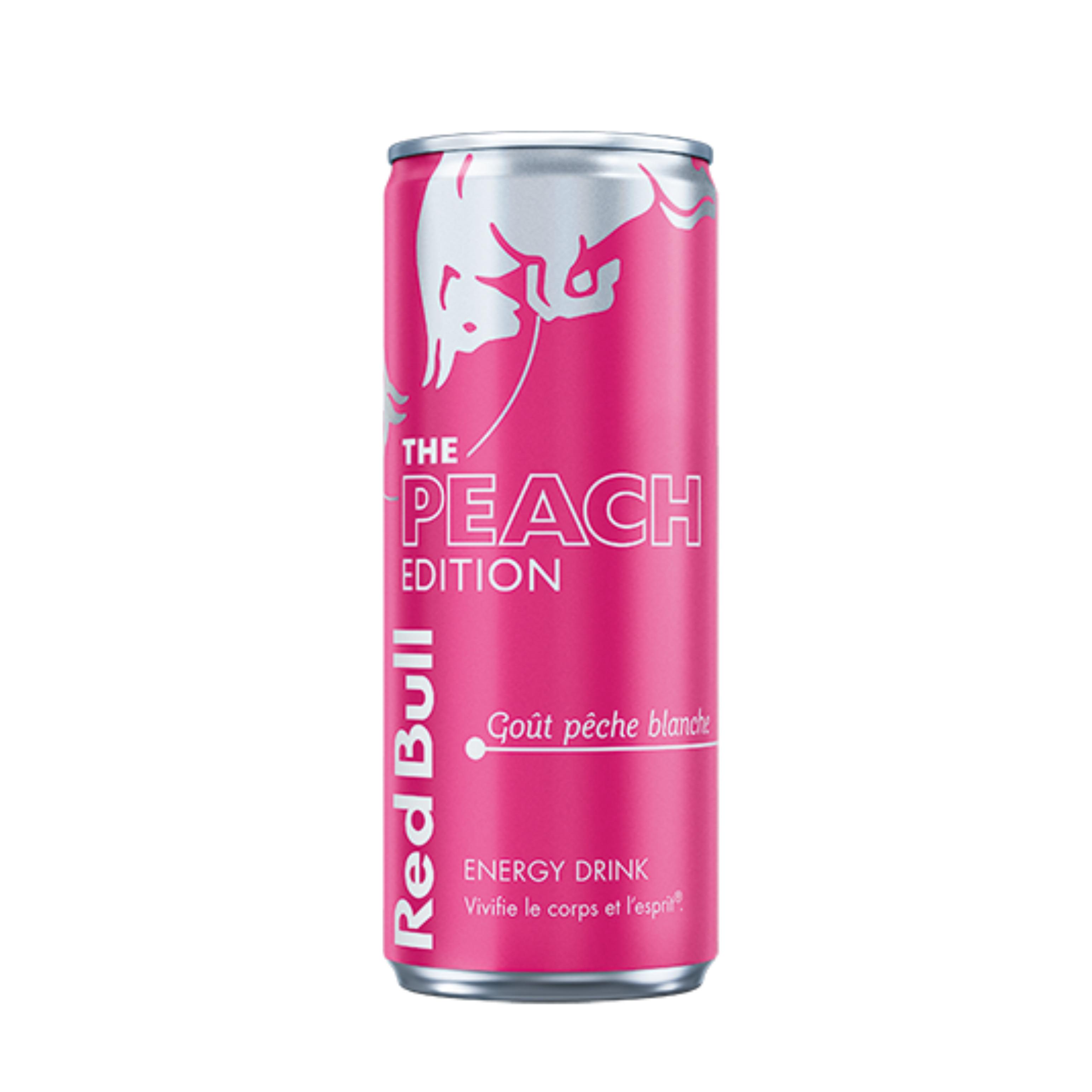 Red Bull, boisson énergisante, goût Pêche blanche, 250ml - La formule unique de Red Bull The Peach Edition contient des ingrédients de haute qualité : caféine (0,03%), taurine (0,4%), vitamines du groupe B, sucres, eau. - Une canette de 250 ml de Red Bull The Peach Edition contient 80 mg de caféine, soit à peu près la même quantité que dans une tasse de café maison. - La quantité de sucres dans une canette de Red Bull The Peach Edition est comparable au niveau de sucres dans une quantité équivalente de jus de pomme ou d'orange - 11 g pour 100 ml. - Les canettes Red Bull sont fabriquées en aluminium 100 % recyclable. - Vivifie le corps et l'esprit.®