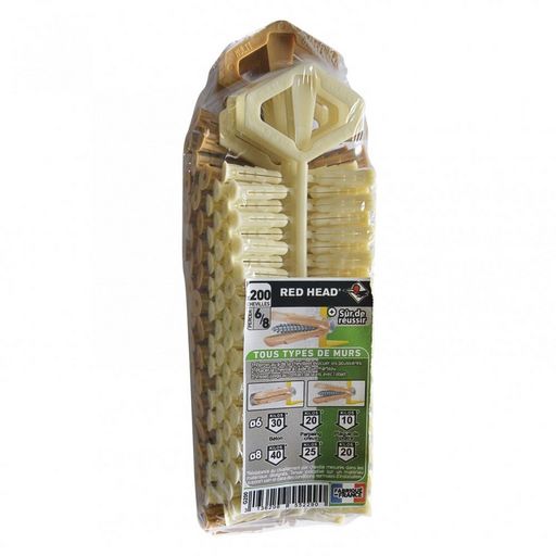 S'adapte à tous types de matériaux, blocage en fin de course, repérage couleur du diamètre de la visMarque du produit: RED HEADType de mur: Tout type de murDiamètre de perçage (en mm): 6Longueur de la cheville (en mm): Moins de 50Diamètre de la cheville (en mm): 6Composition du kit: 200 chevilles Gr