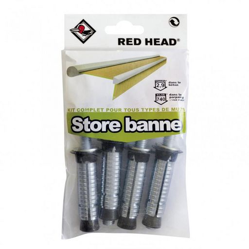 Solution complète pour réaliser la fixation de votre objetType de mur: Tout type de murComposition du kit: 4chevilles G2X 16x65mm et 4 vis 10x90mmMatière du support: Acier inoxMarque du produit: RED HEADMatière principale: AcierUsage du produit: Store banneLongueur (en mm): 65Diamètre de la cheville