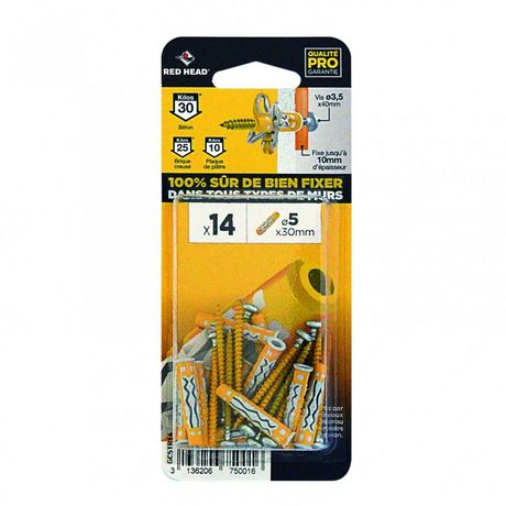 Lot de 14 chevilles et vis couleur RED HEAD, Diam.5 mm x L.30 mm