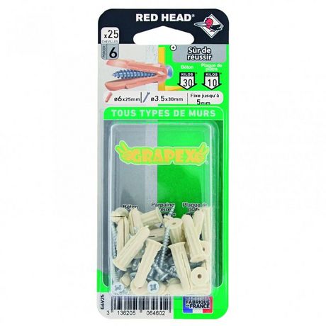 - Composition du kit: 25 chevilles crantées universelles Grapex 6x25mm + vis 3.5x30mm