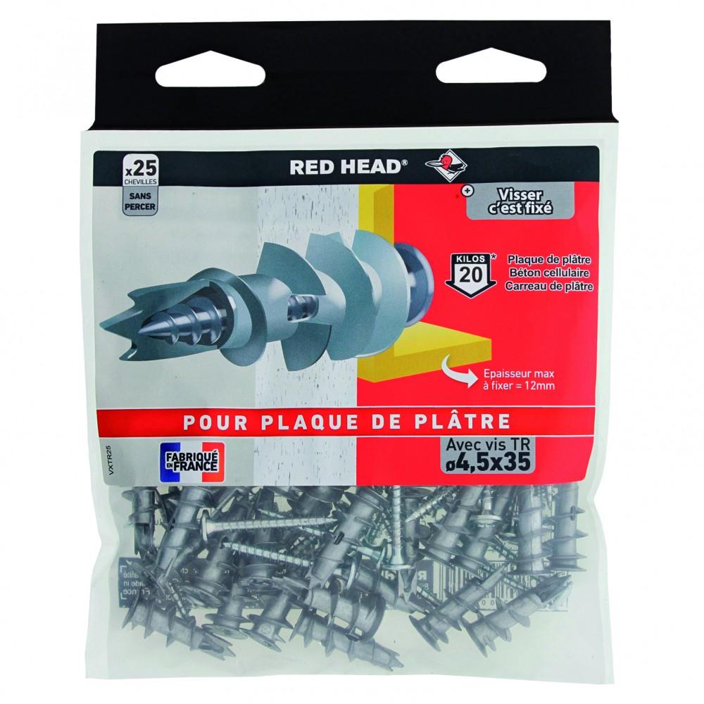 Pas de perçage préalable (la cheville en forme de pointe fore la plaque de platre), blocage en fin de vissagePlus Produit: Pas de perçage préalable (la cheville en forme de pointe fore la plaque de platre), blocage en fin de vissageComposition du kit: 25 chevilles vix, vis tête ronde 4.5x35mmPoids i