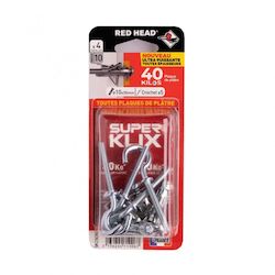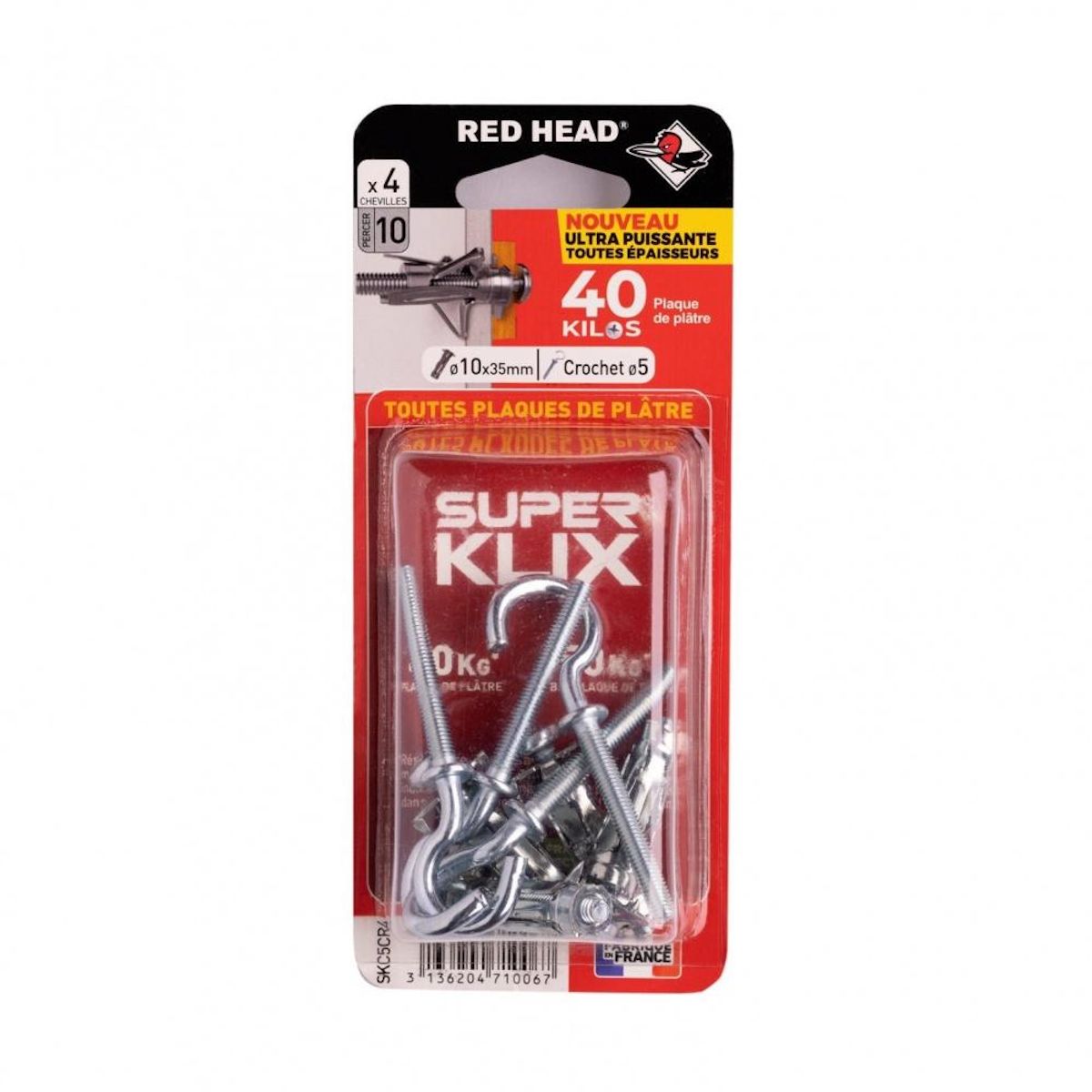 Diamètre de perçage (en mm) : 10Type de mur : Plaque de plâtreComposition du kit : Blister de 4 Superklix 10x35mm + Crochet 5Marque du produit : RED HEADPoids indicatif supporté matériau creux (en kg) : 40Fabrication française : OuiFabrication Union Européenne : OuiFamille de couleur : Gris / arge