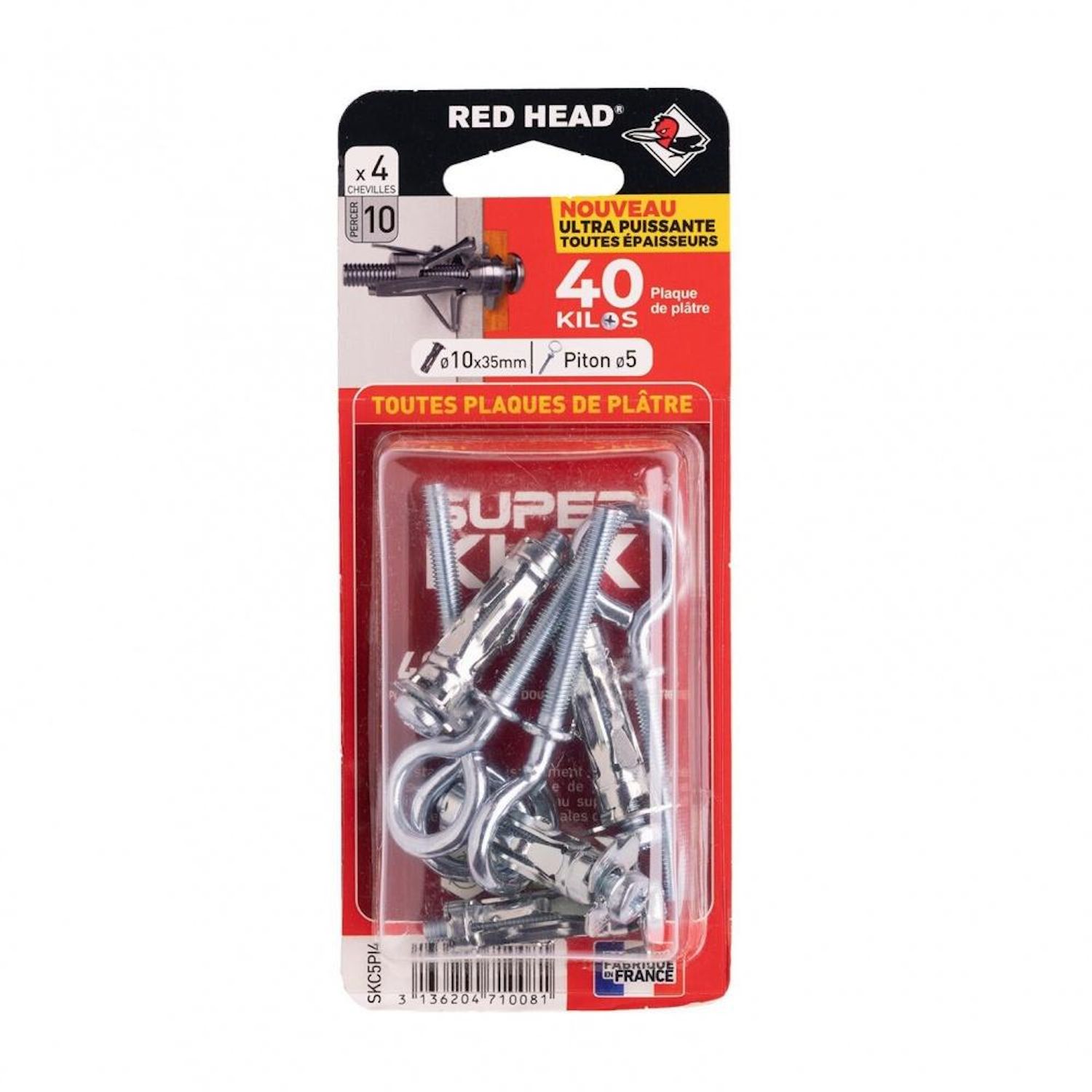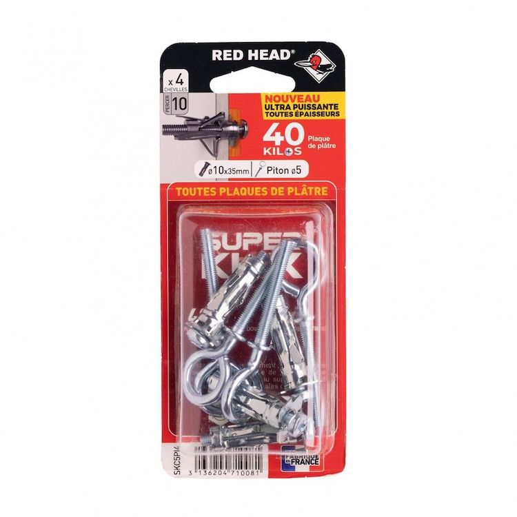Diamètre de perçage (en mm) : 10Type de mur : Plaque de plâtreComposition du kit : Blister de 4 Superklix 10x35mm + pitons 5Marque du produit : RED HEADPoids indicatif supporté matériau creux (en kg) : 40Fabrication française : OuiFabrication Union Européenne : OuiFamille de couleur : Gris / argen