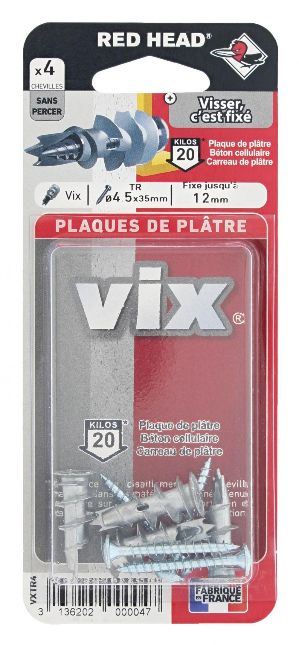 - Composition du kit: 4 chevilles autoforeuses acier vix, vis tête ronde 4.5x35mm