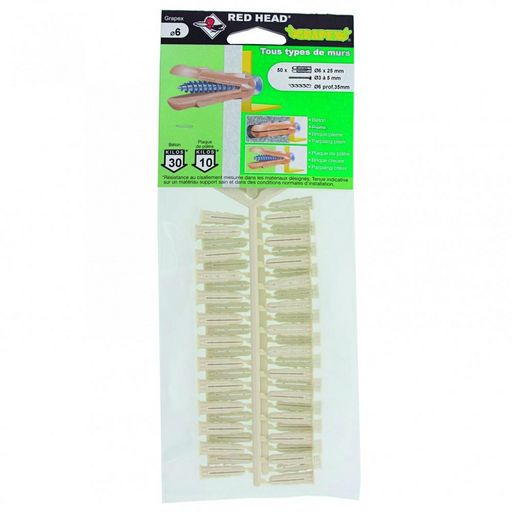 Accepte plusieurs diamètres de visMarque du produit: RED HEADType de mur: Tout type de murDiamètre de perçage (en mm): 6Longueur de la cheville (en mm): Moins de 50Diamètre de la cheville (en mm): 6Composition du kit: 50 chevilles grapex 6x25mmPoids indicatif supporté matériau creux (en kg): 20Poids