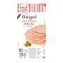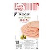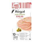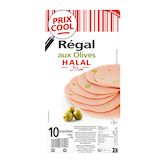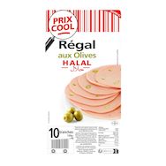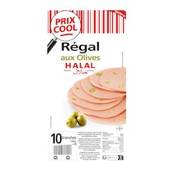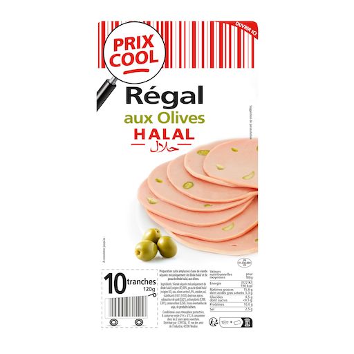 "Ingrédients : Viande séparée mécaniquement de poulet halal (origine UE) 41%, peau de dinde halal (origine UE), eau, amidon, olives vertes 5,3%, fibre de blé (sans gluten), dextrose, sel, conservateurs (E326 E262 E250), chlorure de potassium, épices, plante aromatique, antioxydant (E301). Traces éventuelle de soja, lait."