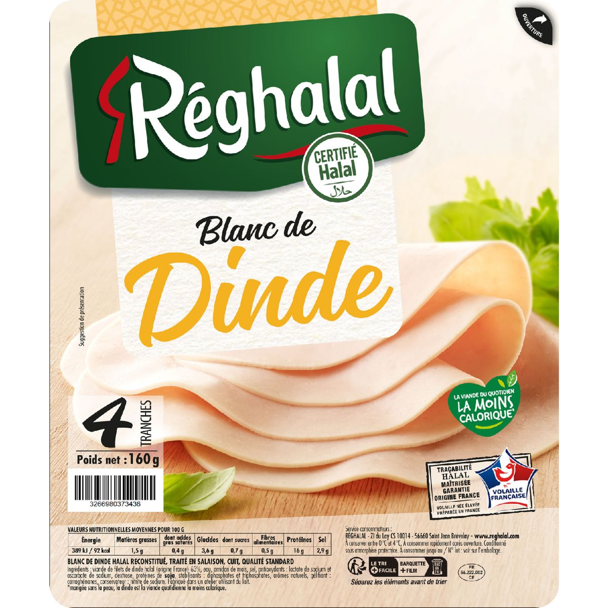 Ingrédients : viande de filets de dinde (origine France) 71%, eau, antioxydants: lactate de sodium et ascorbate de sodium, sel, protéines de SOJA, dextrose, amidon de maïs, stabilisants:diphosphates et triphosphates, arômes naturels, gélifiant: carraghénanes, conservateur : nitrite de sodium. Peut contenir du lait.