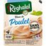 Ingrédients : Viande de filets de poulet (origine France) 77%, eau, sel, protéines de SOJA, antioxydants : lactate de sodium et ascorbate de sodium, dextrose, arômes naturels, stabilisants : diphosphates et triphosphates, gélifiant : carraghénanes. Fabriqué dans un atelier utilisant du lait.
