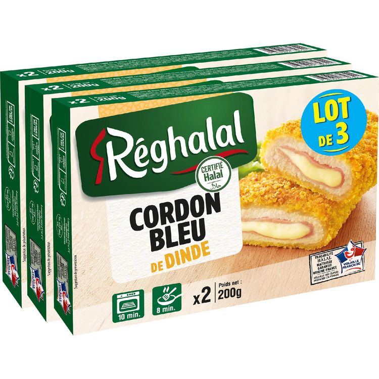 Viande de dinde traitée en salaison, fourrée au jambon de dinde et au fromage fondu, panée et cuite. Savoureux et croustillant, le cordon bleu de dinde Réghalal vous offre praticité et gourmandise, idéal pour agrémenter une recette halal rapide et simple.