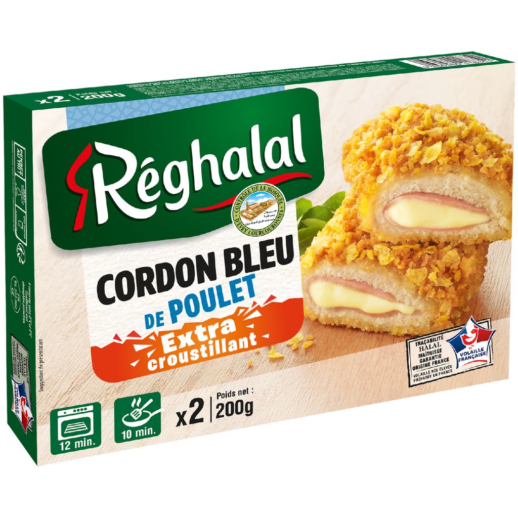 Viande de poulet halal traitée en salaison, fourrée au jambon de dinde halal et au fromage fondu, panée et cuite
