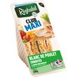 Ingrédients : Pain de mie complet 50% (farine de BLÉ complète, eau, huile de colza, GLUTEN de BLÉ, sucre, sel, dextrose, levure, farine de BLÉ, émulsifiant : E471, antioxydant : E300), filets de poulet Halal traité en salaison reconstitué cuit standard 20% [filet de poulet Halal (origine : France) 15, 4%, eau, sel, protéines de SOJA, antioxydants : E325 et E301, dextrose, arômes naturels, stabilisants : E450 et E451, gélifiant : E407], tomate 10%, mayonnaise allégée en matières grasses 7, 3% [eau, huile de colza, vinaigre d'alcool, jaune d'œuf, amidon transformé, sucre, MOUTARDE de Dijon (eau, graine de MOUTARDE, vinaigre, sel), sel, LAIT écrémé reconstitué, acidifiant : E330, épaississant : E415], salade 5%, yaourt maigre, carotte 2, 5%, fibre de BLÉ, ciboulette.