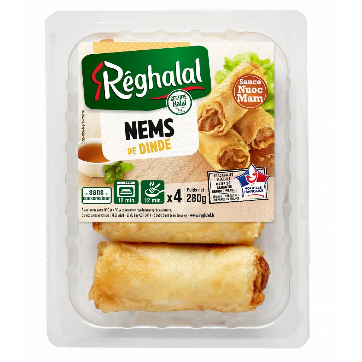 Les nems de dinde Réghalal vous feront voyager! Avec leur sauce Nuoc Mam ils se dégustent aisément enroulés dans une feuille de laitue. Nems de dinde halal Rapides à réchauffer au four ou à la poêle.