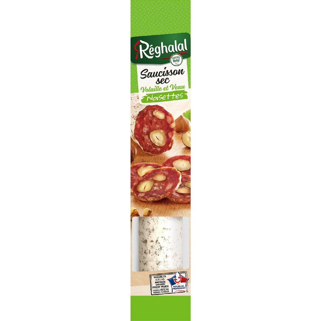 Réghalal vous propose un saucisson sec de volaille aux noisettes, un mélange de texture à la fois tendre et croquante. Une viande origine France rigoureusement sélectionnée, accompagnée de généreux éclats de noisettes . À déguster en fines tranches lors de moments conviviaux.