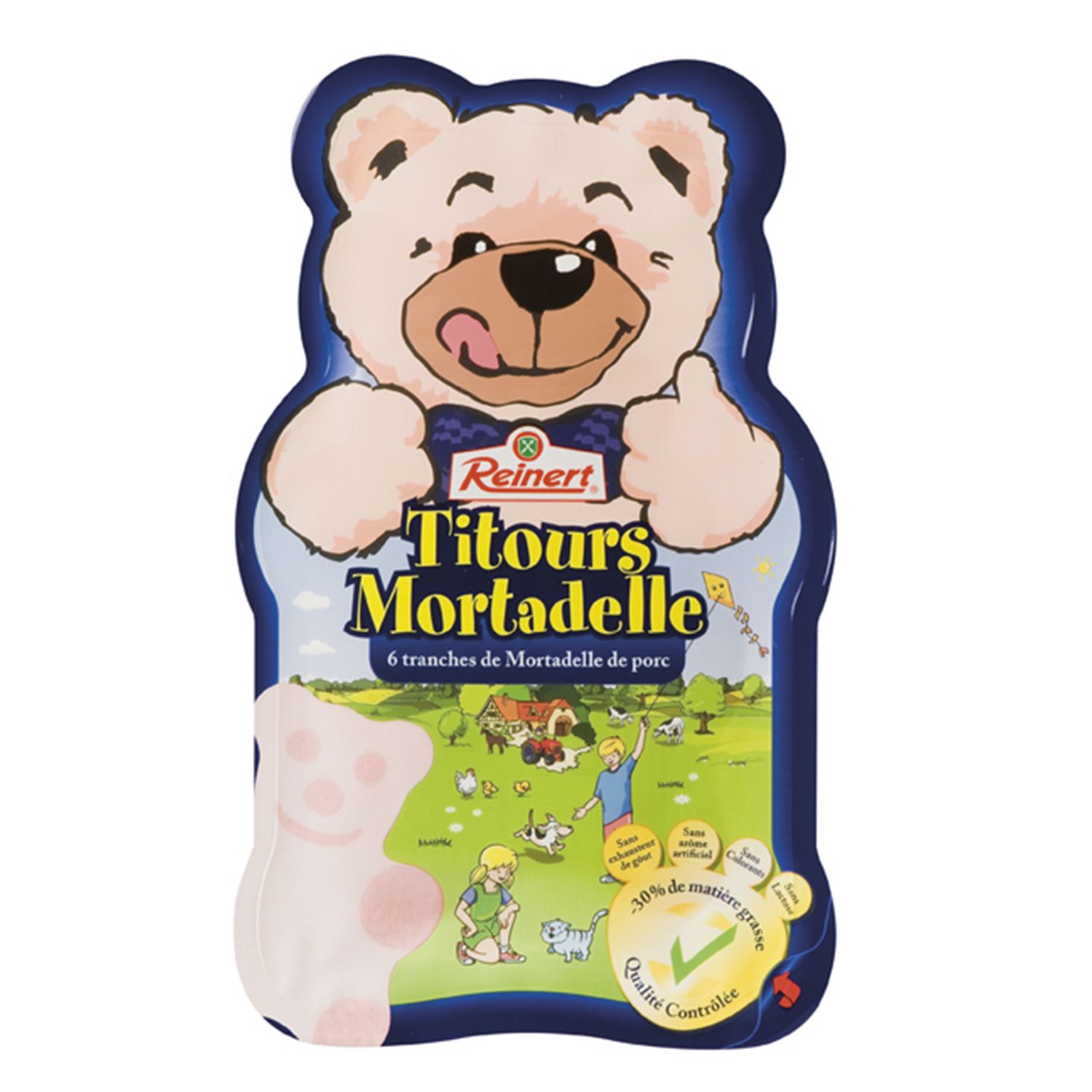 composé à base de viande de porc Titours mortadelle en format 80g est spécialement adapté au goût des enfants, et est sans arôme artificiel, sans colorant, sans exhausteur de goût et sans lactose.
