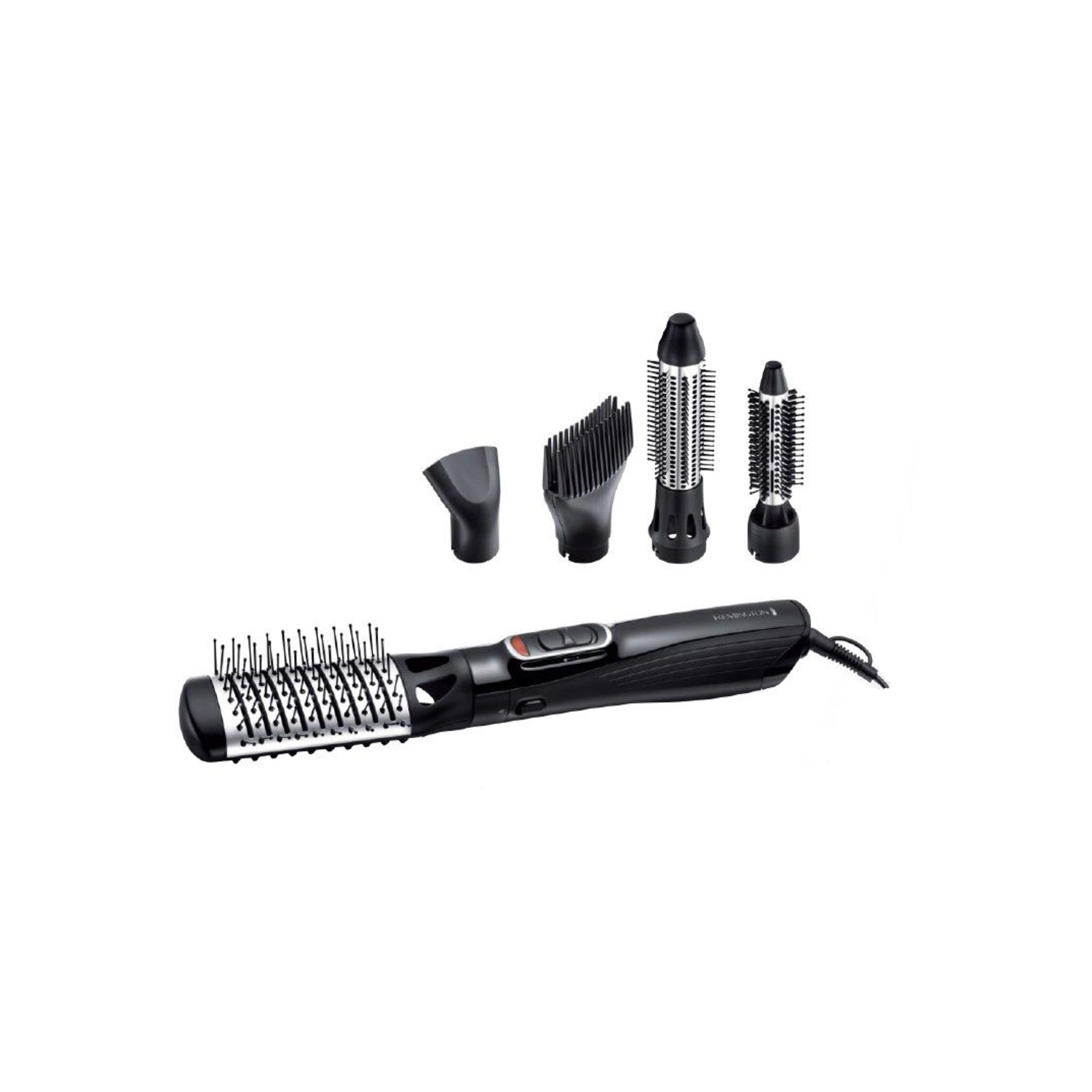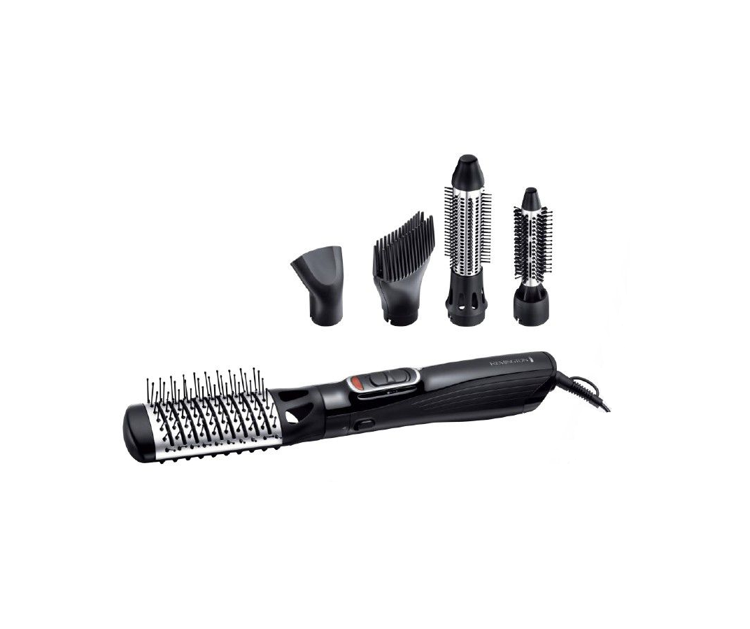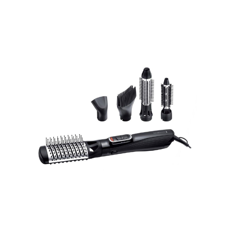 5 en 1 - 1200W - Fonction ionique - Picots en céramique - 2 niveaux de vitesse/température - Air frais fixateur - 5 accessoires : 3 brosses, 1 peigne volumateur et 1 concentrateur inclus - Vanity de rangement