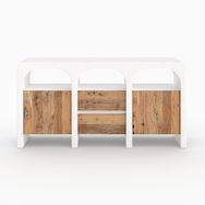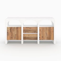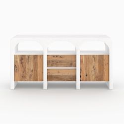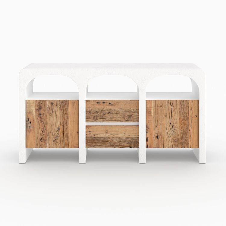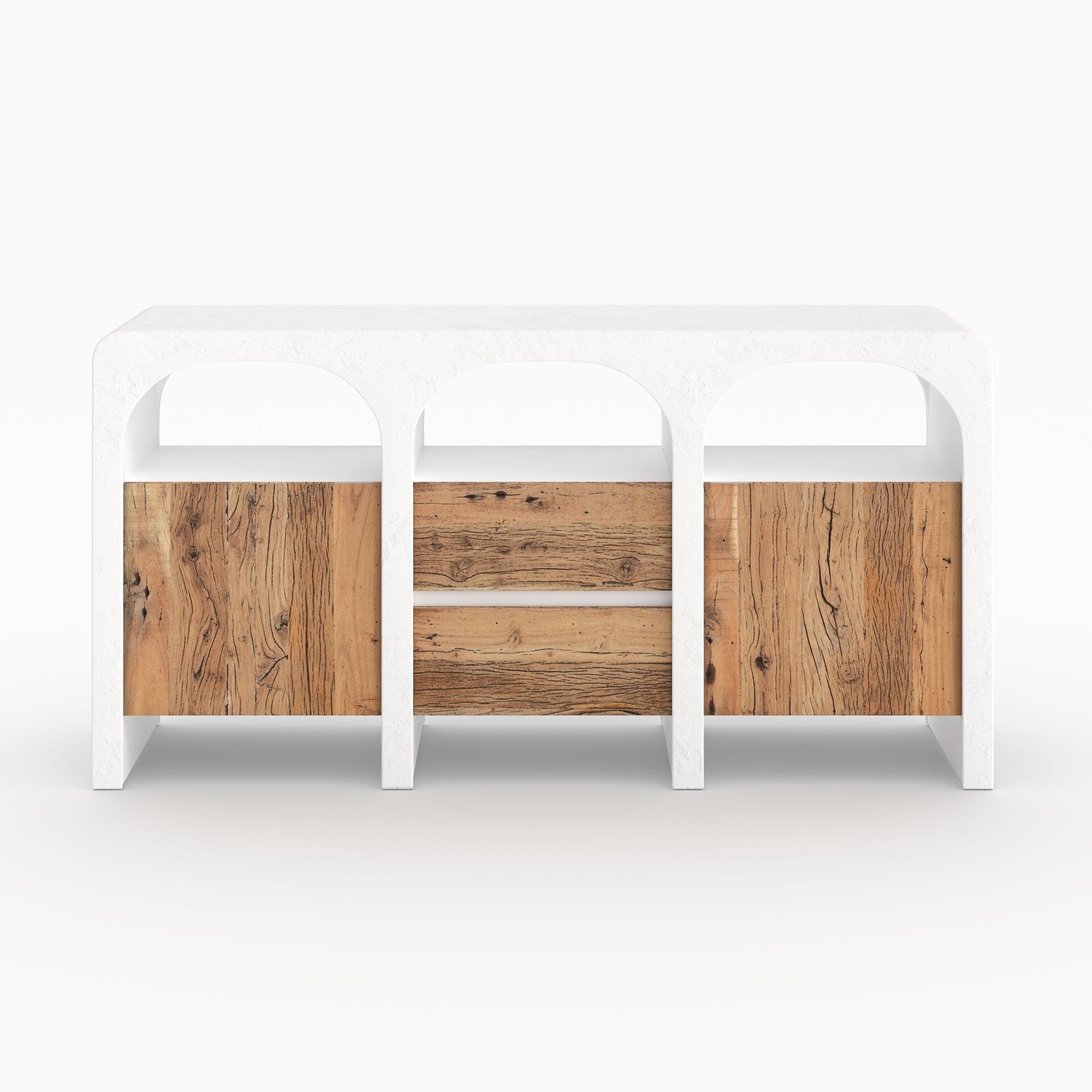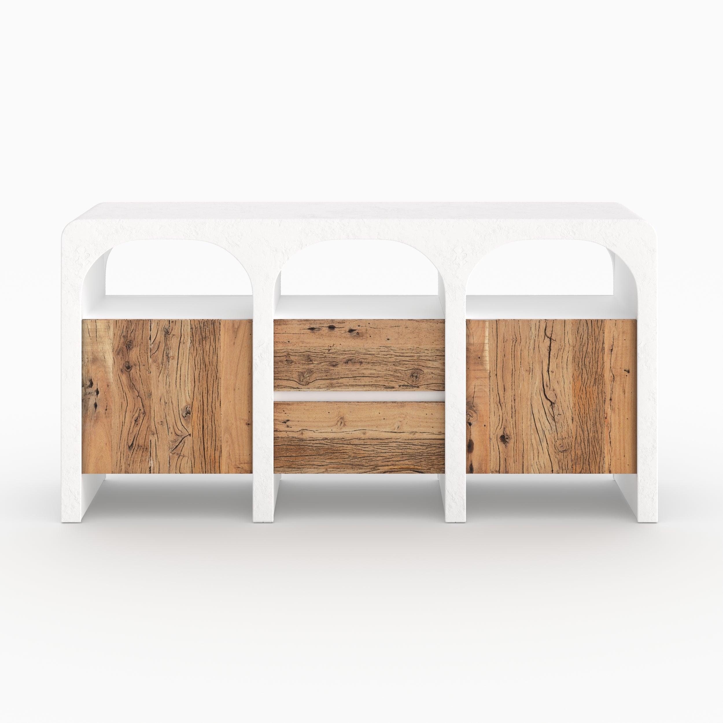 Buffet Fira en béton blanc cassé et bois - -Contenu : Vendu à l'unitéDimensions : Longueur : 160 cmProfondeur : 40 cmHauteur : 80 cmMatière : Structure en boisFinition en bétonPortes en bois recycléInfos complémentaires : Poids max supporté : 30 KgMontage : Aucun montagePoids produit : 75.45kgEntret