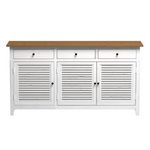 On aime qu'un buffet s'impose par ses proportions et son caractère. C'est le cas avec ce modèle aux dimensions généreuses (L 170 x P 43 x H 95 cm). Dédié aux rangements, il comprend trois tiroirs (48 x 11,5 cm) qui peuvent accueillir des couverts et les objets indispensables au quotidien. Ses trois portes dissimulent des étagères qui vous permettront aussi de ranger de la vaisselle ou du linge de maison.