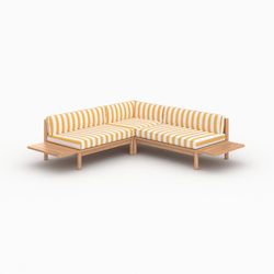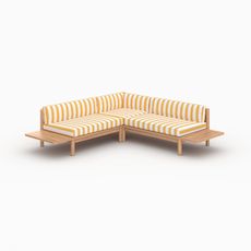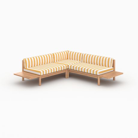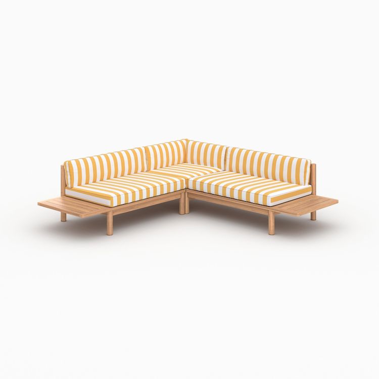 Le canapé d&rsquo,angle Nadila 4 places en teck massif s&rsquo,illumine avec ses coussins rayés jaune citron. Pratiques, leurs housses sont déhoussables pour un lavage facile.
