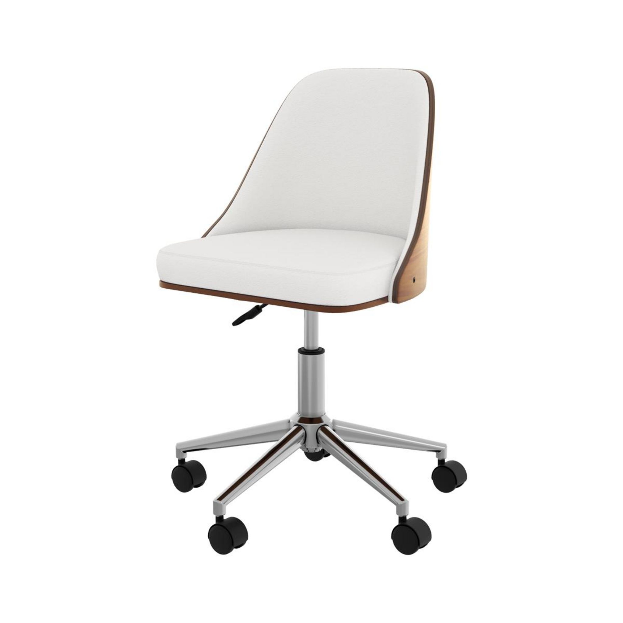 La technique du plié en lamellé collé offre des formes arrondies, comme avec cette chaise de bureau. Son dossier maintient ainsi correctement le dos tout en se distinguant par son esthétique. Un rembourrage dense et un coussin accentuent l'allure confortable de ce siège. Son assise en cuir synthétique est en harmonie avec le sombre. Enfin, un piétement en métal chromé doté de roulettes accentue l'aspect graphique. Comme elle pivote, cette chaise est pensée pour votre confort dans le moindre détail.