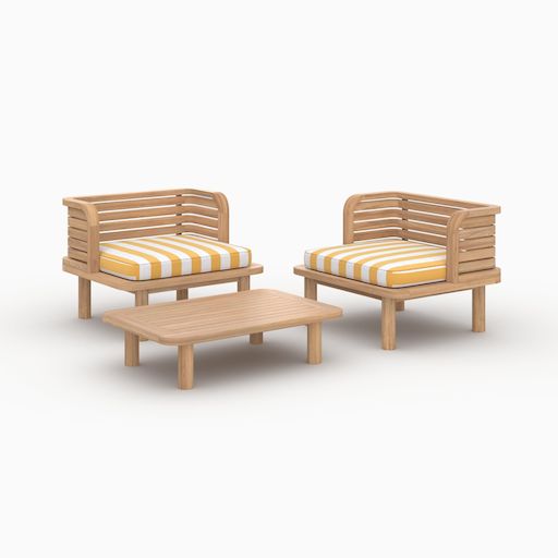 Le salon de jardin Kilda 2 places se compose de deux fauteuils et d&rsquo,une table basse en teck massif, reconnu pour sa robustesse et son élégance naturelle. Les coussins en tissu rayé jaune poussin, déhoussables et confortables, apportent une touche fraÎche et solaire tout en assurant un usage pratique au quotidien.