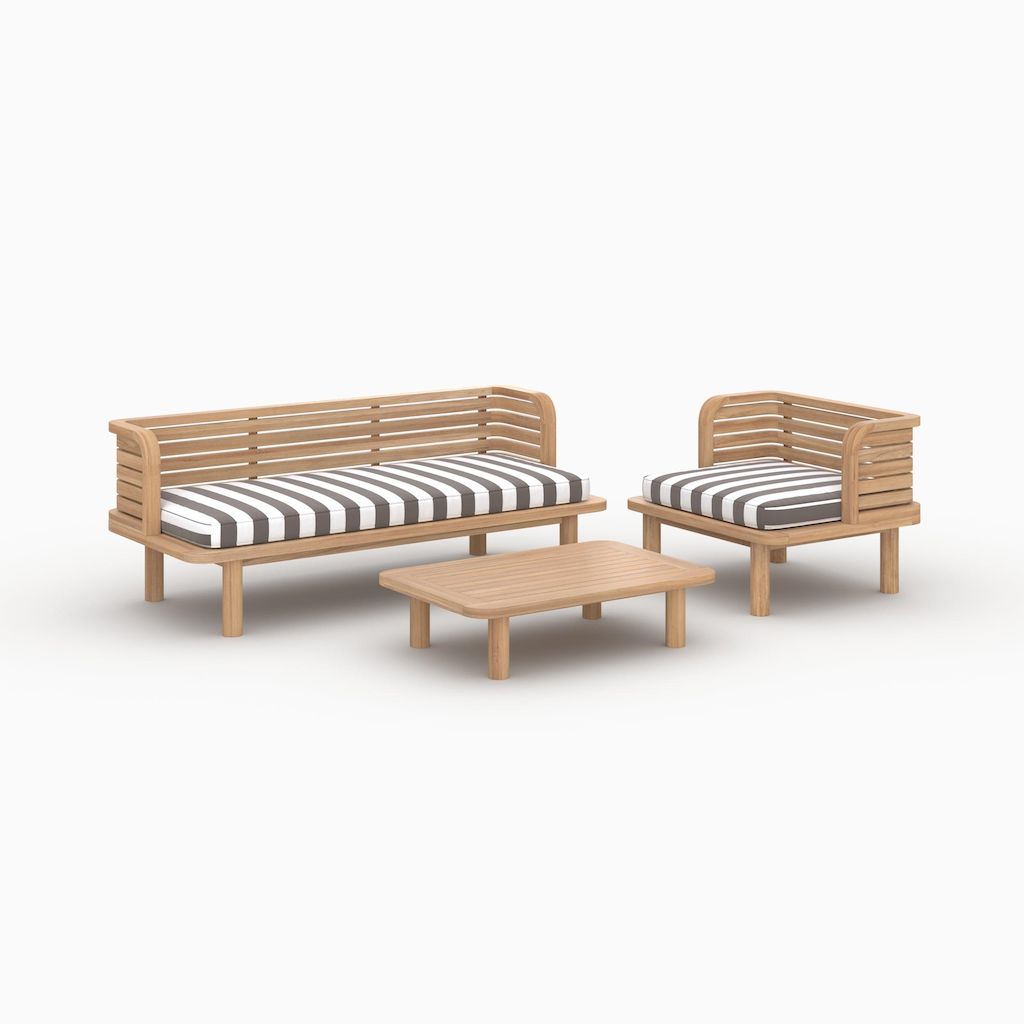 Le salon de jardin Kilda 3 places réunit un canapé, un fauteuil et une table basse en teck massif, choisi pour sa solidité et sa tenue dans le temps. Les coussins en tissu rayé gris offrent un confort agréable et une allure sobre, facile à intégrer à tous les styles d&rsquo,extérieur. Déhoussables, ils allient esthétique et praticité.
