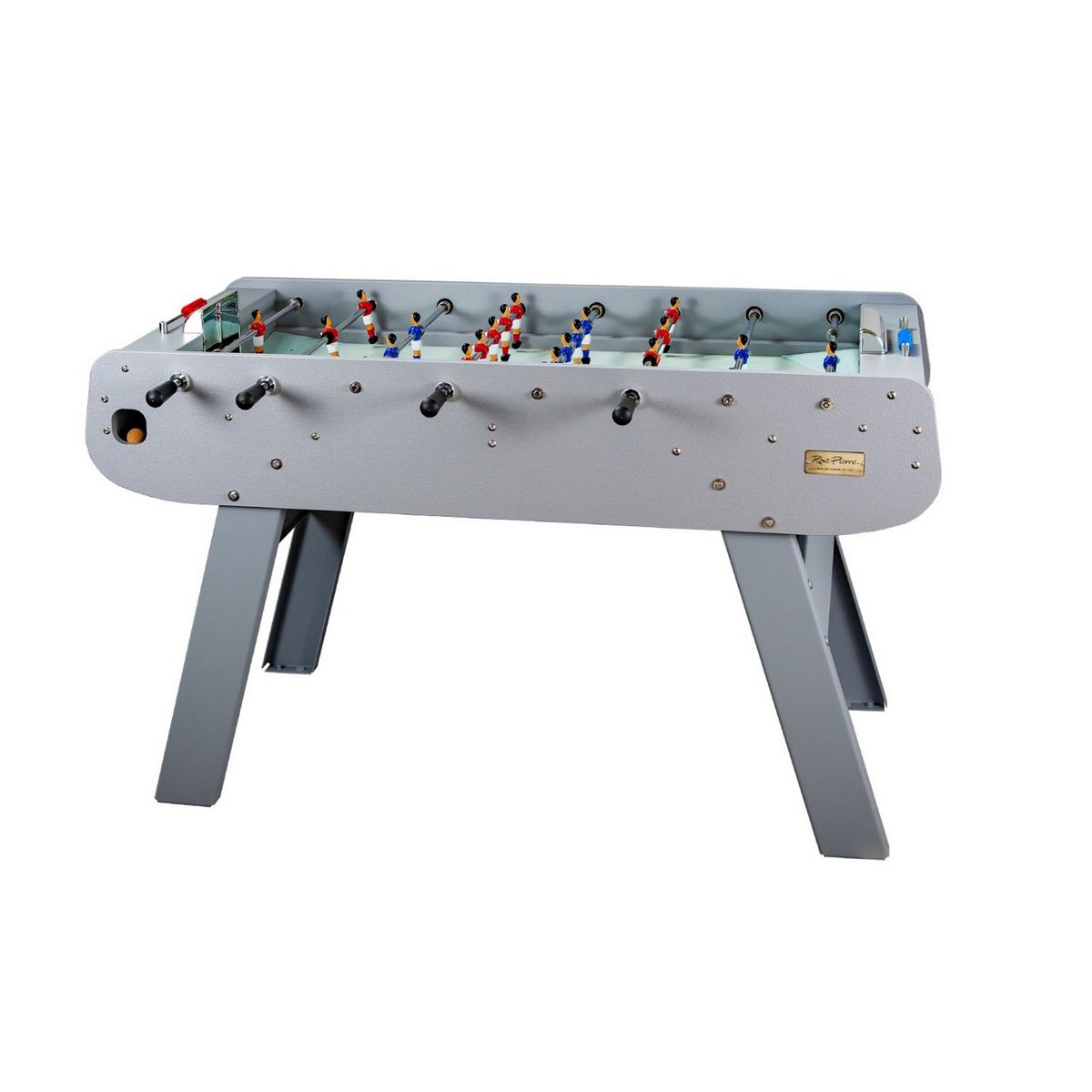 Baby-foot pour aires de jeux intérieures ou extérieures. Jeu de barres en acier avec triple chromage et joueurs métal vissés sur les barres, décorés à la main. Puissance de tir et parfait contrôle de la balle. Double compteurs de points bicolores. Retour latéral des balles. Construction générale en résine thermoplastique haut densité, teintée dans la masse (imputrescible, résistant à l’humidité, le gel, la chaleur, l’exposition aux UV, 100% recyclable). Surface de jeu hydrofuge, anti-moisissures recouverte d’un linoléum vert d’eau. Piètement en acier thermolaqué. Visserie acier inoxydable. Poignées ergonomiques professionnelles. Meuble compact et stable garanti 3 ans. Jeu entièrement prémonté en usine. Fabriqué en France.