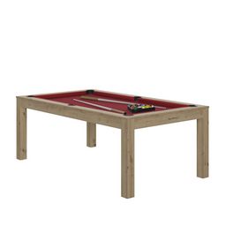 Billard avec pieds en bois massif. Finition en panneau mélaminé décor chêne sablé. Châssis métallique garantissant la rigidité du billard. Vérin de réglage à la base du pied pour permettre une planéité parfaite. Plateau de jeu en ardoise monobloc de 19 mm, parfait roulement de la bille. Tapis professionnel de couleur verte. Réceptacle de billes dans chaque poche. Accessoires inclus : 2 queues de 1.20m, 1 triangle, 16 billes numérotées de 57 mm, 1 brosse, 1 craie, règle du jeu. Fabriqué en France.