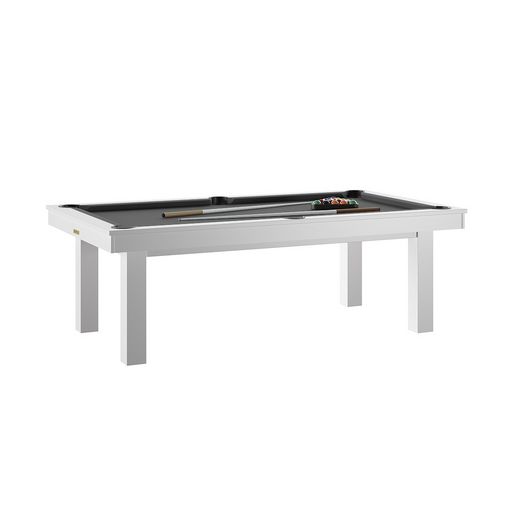 Découvrez un vrai billard avec drap gris transformable en table de couleur blanc brillant. Raffinement et robustesse sont les maîtres-mots des billards conçus et fabriqués en France par René Pierre. Les réceptacles de boules sont incorporées dans le plateau. Ses pieds en bois massif sur disposés sur