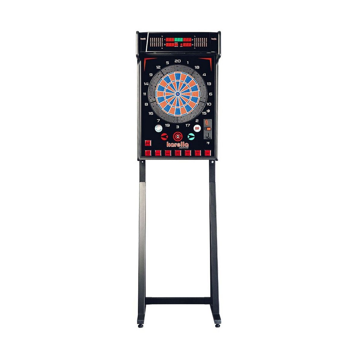 Jeu de fléchette professionnel avec support métal. Polyvalent, il peut être fixé directement au mur, sans son support. - Pour 4 joueurs, changement de joueur automatique. Eclairage LED. Accepte des fléchettes jusqu'à 21 g. Capteur pour la détection de faux jet. Comptabilité électronique. Jeux: 180, 301, 501, 701, 901, cricket, parcheesi. Options de jeu: Double In, Double Out, Master Out, Team, Cut Throat. Options de réglage Bull (50/50) ou (25/50) commutable, etc. Monnayeur électronique. mode de jeu libre permanent possible. Livré avec 6 fléchettes Karella, une ligne de lancer, d'un ruban à mesurer et d'un kit de montage. Alimentation sur secteur. Livré avec cordon d'alimentation